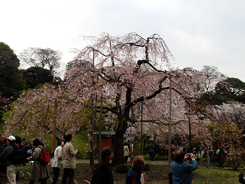 ソメイヨシノよりも1週間程早く咲きはじめるしだれ桜の中でも、入り口正面にあるものが見事で小石川後楽園を代表する桜です。